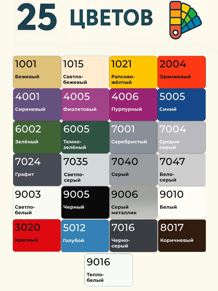 - Палитра из 25 цветов - складская позиция, а по спец. заказу любой оттенок по картотеке RAL — по выгодной цене и широкого выбора цвета краски и степени блеска: